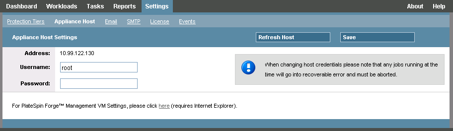 This is where you enter credentials for the host running PlateSpin Forge, if the credentials have been changed since the initial configuration. Click .