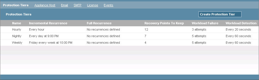 This is where you create custom protection tiers that can be used when configuring a workload’s replication details. For more information, see Protection Tiers, Workload Details and Tier Settings.