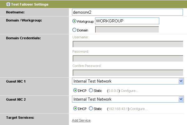 These settings are used when the recovery workload is brought online as a test. These settings are similar to the Failover settings.