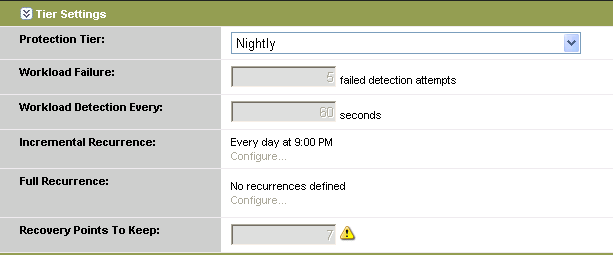 These settings define when and how often a workload’s replications occur. You can select one of the built-in Protection Tiers or one that you have previously created from the Protection Tier drop-down list. You can also select , which allows you to customize the settings just for this workload. Custom settings are not accessible by other workloads and it is recommended that you create the Protection Tier beforehand to save time and effort. See Protection Tiers and Creating a Protection Tier for more information.