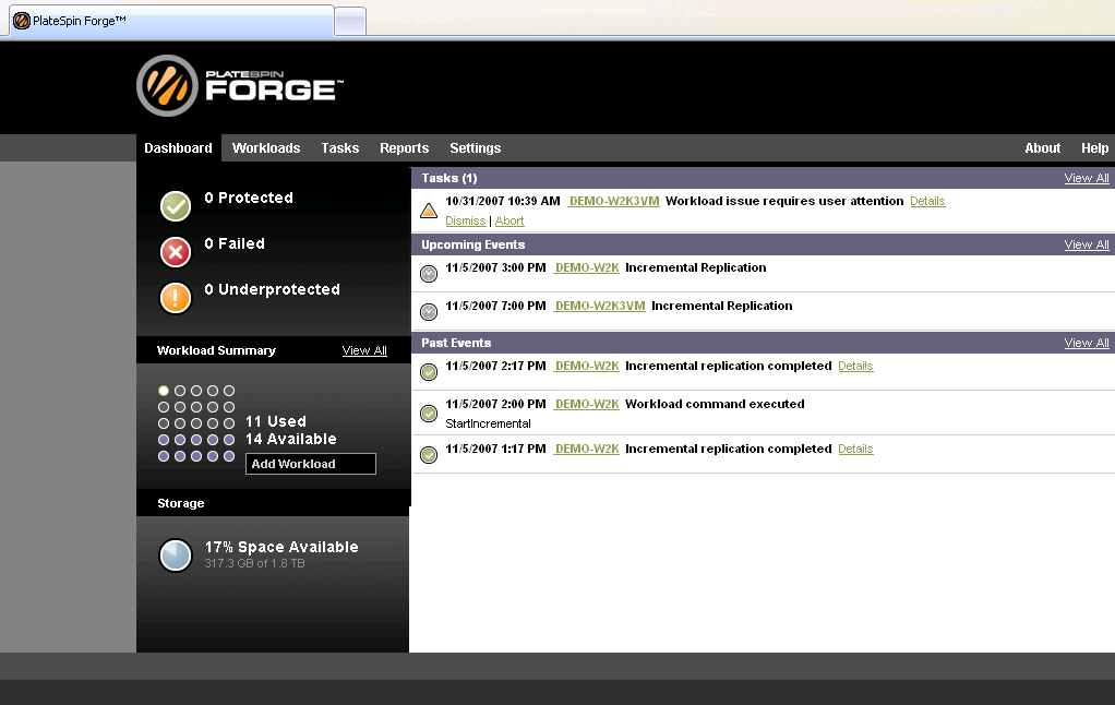 The Dashboard page is the appliance’s home page. From the Dashboard page you can see an overview of the PlateSpin Forge appliance’s workload status, activity, and availability.