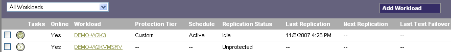 The Workloads page displays a table with a row for each workload currently on the PlateSpin Forge appliance. Use the drop-down list to filter on all workloads, protected workloads,, failed workloads, or unprotected workloads. Each row shows the workload’s name and the name of the associated Protection Tier. Click a workload name to display a Workload Details page for viewing or editing configuration relevant to the workload. See Workload Details for more information.
