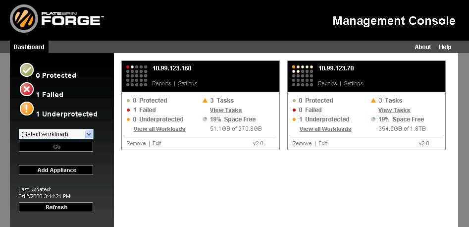 The PlateSpin Forge Management Console client is included with each PlateSpin Forge hardware appliance. The Console is a browser-based application providing centralized access to multiple PlateSpin Forge appliances. In a data center with more than one Forge appliance deployed, one of the appliances is the Manager and the Management Console is run from there. The other Forge appliances are added under the Manager, providing a single point of control and interaction.