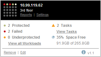 Hyperlinks on each card allow you to navigate to that particular appliance’s Workloads, Reports, Settings, and Tasks pages. There are also hyperlinks that allow you to edit a card’s configuration or remove a card from the display.