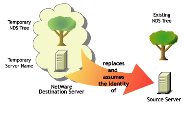 After the source server's file system and NDS database is migrated to the destination server, the source server is automatically brought down and the destination server reboots and assumes the name and identity of the source server on your existing network.