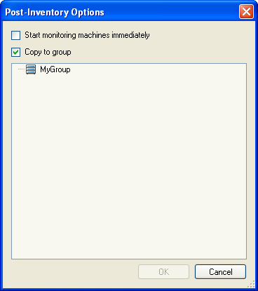 Select to begin monitoring each machine discovered when the inventory is complete. Leave the check box cleared to start monitoring later. Select and then select a target Group from those displayed in the list box to copy all the inventoried machines to that group.
