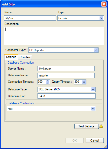 On the tab, provide the required information for connecting to the HP Reporter database: database hostname, database or database instance name, database type, port number (if a non-default port number is used), and valid credentials for accessing the database.