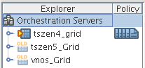 The icons to the right of a current Orchestrate Server represent its polices, either those added by default upon server install and configuration, or those added later. A drop-down menu of all associated policies is opened when you right-click the policy icon(s). From there, you can select a policy to open in the Policy Editor. For more information about policies, see Section 5.8.1, The Policy Object.