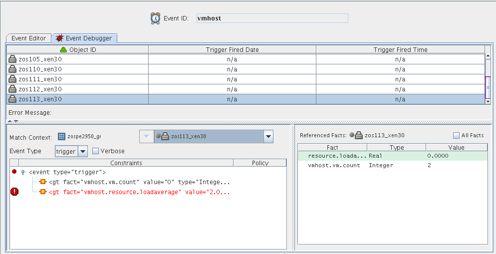 Depending on the Event, the debugger identifies the Grid objects (Job, Jobinstance, Resource, Repository, User, or VMHost) that define the context of the trigger or reset rules specified in the Event XML.