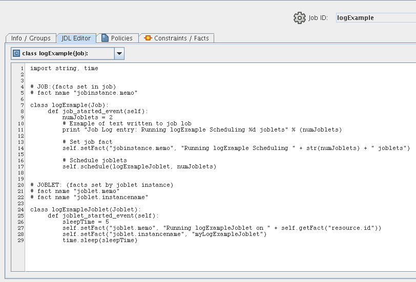 The following job example shows logExample.jdl output inthe JDL editor of the Orchestrate Development Client.