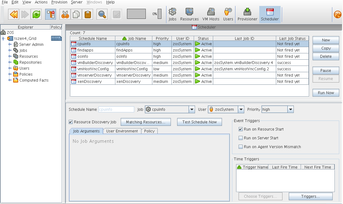 After PlateSpin Orchestrate is enabled with a license, users have access to a built-in job Scheduler. This GUI interface allows jobs to be started periodically based upon user scheduling or when various system or user-defined events occur.