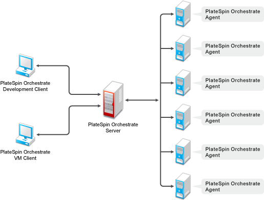 A simple view of the PlateSpin Orchestrate system architecture is shown below, showing the PlateSpin Orchestrate software components: