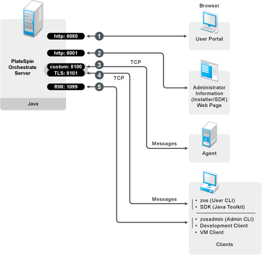 When the administrator invokes the zosadmin command line interface (available after PlateSpin Orchestrate clients — including the Orchestrate Development Client — are installed on a machine), or when using the PlateSpin Orchestrate Development Client, those client tools communicate with the Orchestrate Server over port 1099, which uses a Java RMI (Remote Method Invocation) protocol.