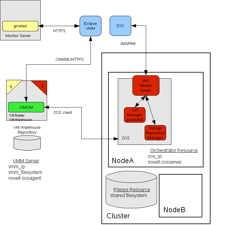The following figure illustrates how PlateSpin Orchestrate is configured for use in a high availability environment.
