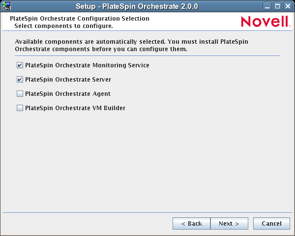 Because you installed only the Platespin Orchestrate Server and the PlateSpin Orchestrate Monitoring Service, no other products need to be selected.