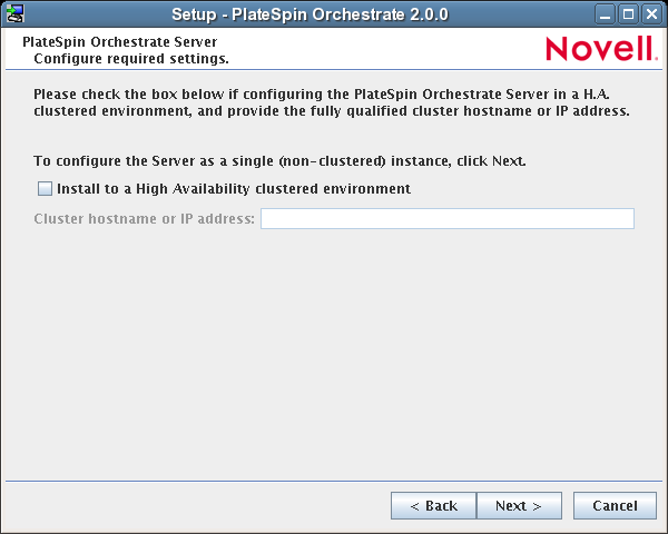 NOTE:As you prepare to install PlateSpin Orchestrate 2.0 and use it in a high availability environment, make sure that the requirements to do so are met. For more information, see Planning the Orchestrate Server Installation