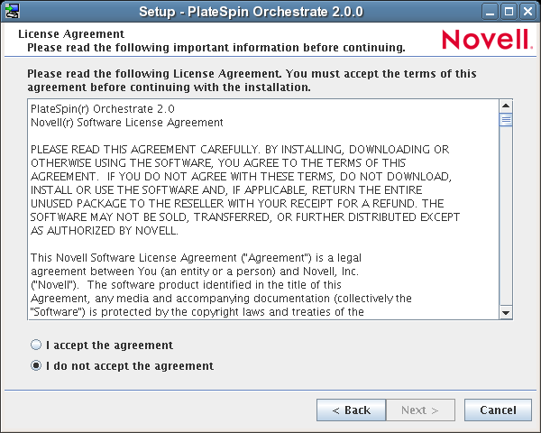 Welcome to Novell PlateSpin Orchestrate. This program will configure Novell PlateSpin Orchestrate 2.0 Select whether this is a new install or an upgrade i) install u) upgrade - - - - - - Selection [install]: