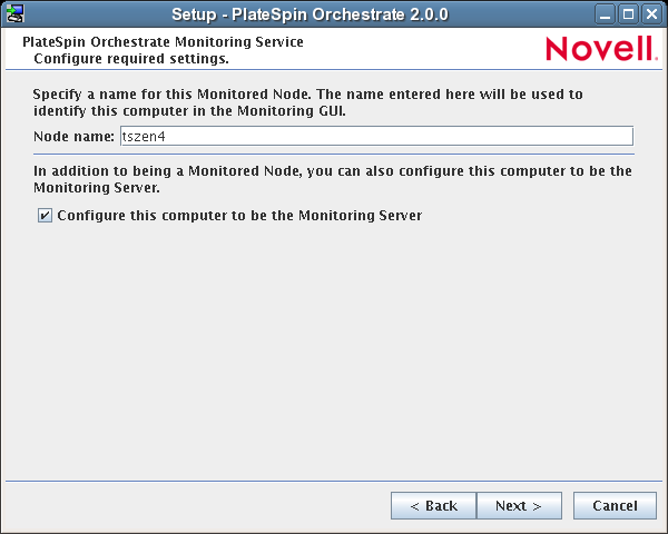 Gathering information for PlateSpin Orchestrate Monitoring Service configuration. . . You can configure this host to be the Monitoring Server or a monitored node Configure this host as the Monitoring Server? (y/n) [y]: