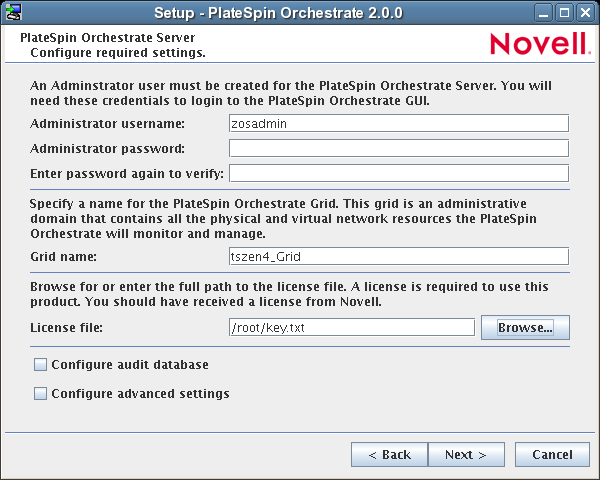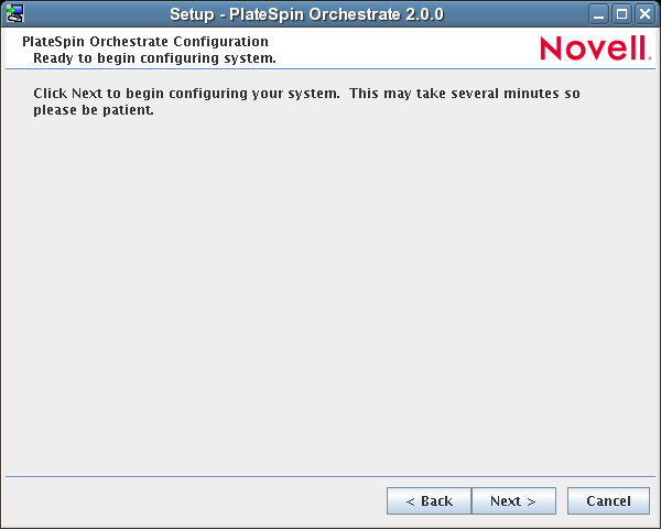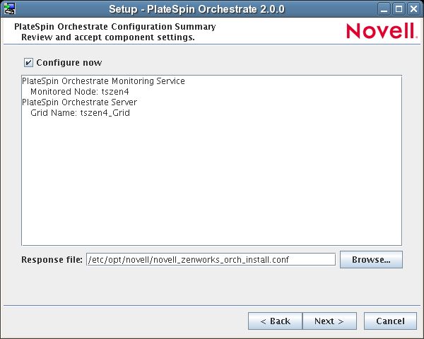 Run the text-based configuration script or the GUI Configuration Wizard to configure the PlateSpin Orchestrate components you have installed (including any type of installation of the agent). As you do this, you need to remember the hostname of the Orchestrate Server (that is, the primary Orchestrate Server node), and the administrator name and password of this server. For more information, see Installing and Configuring All PlateSpin Orchestrate Components Together