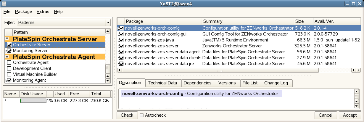HINT:If they are not already selected by default, you need to select the packages that are in the PlateSpin Orchestrate Server pattern, the Monitoring Server pattern, and the Monitoring Client pattern.