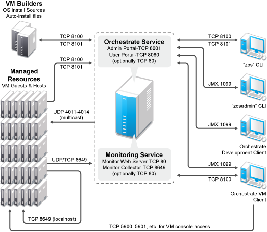 The Orchestrate Server must allow traffic on TCP ports 80, 8001, 8100, 8101 (these four ports are configurable), and UDP and TCP port 1099 (mandatory). The following list summarizes the network resources required in a PlateSpin Orchestrate setup: