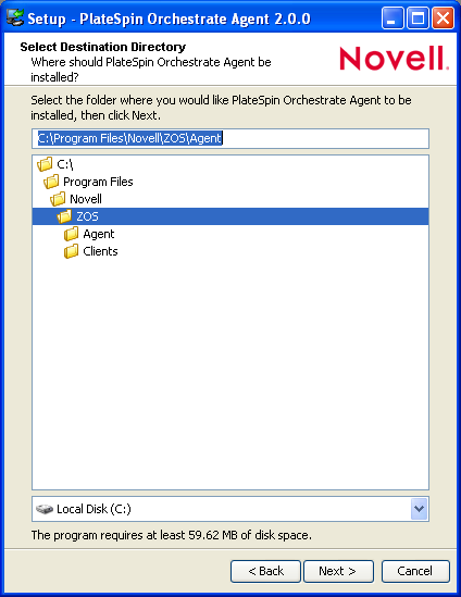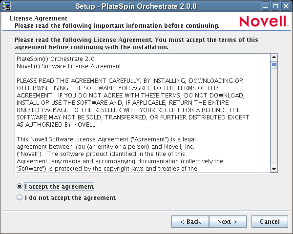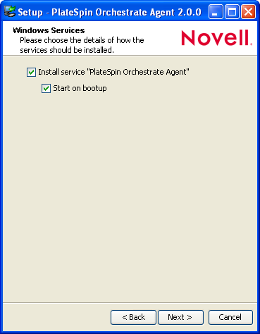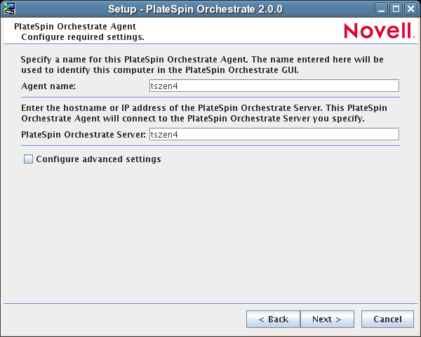 NOTE:The remaining steps in this procedure show the installation of the Orchestrate Agent as an example of component installation. Steps for installing any of the other components are similar. Refer to Section 2.2.2, PlateSpin Orchestrate Configuration Information for further information you might need to configure a component.