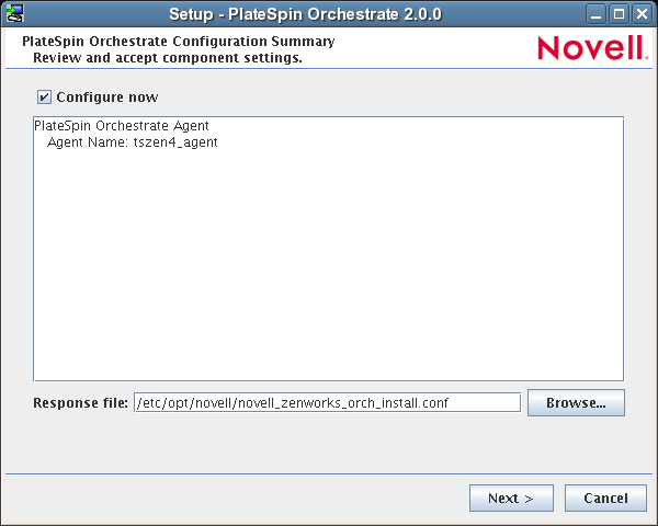 By default, the check box on this page is selected. If you accept the default of having it selected, the wizard starts the PlateSpin Orchestrate Agent and applies the configuration settings. If you deselect the check box, the wizard writes out the configuration file to /etc/opt/novell/novell_zenworks_orch_install.conf without starting PlateSpin Orchestrate or applying the configuration settings.