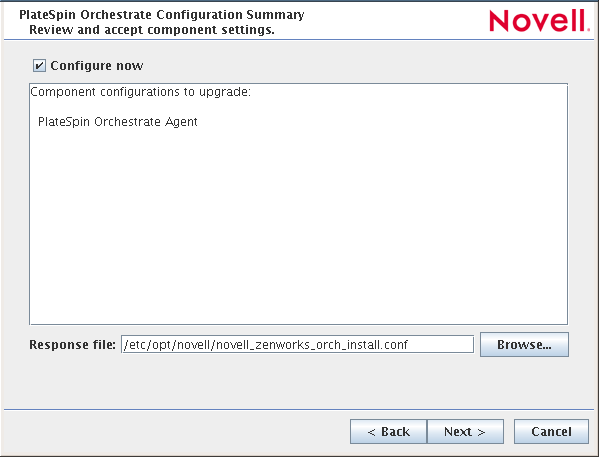 Deselect the Configure now check box so that the wizard can write the configuration file to /etc/opt/novell/novell_zenworks_orch_install.conf without starting Orchestrator or applying the configuration settings.