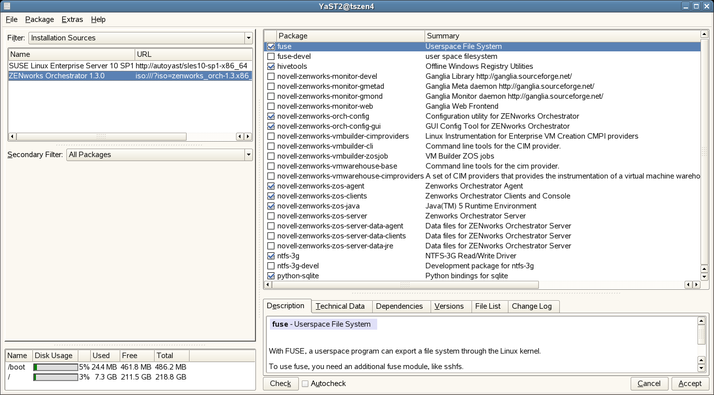 Use the following procedure if you want to use YaST, a graphical user interface, to upgrade the ZENworks Orchestrator packages. If you want to use the GUI Configuration Wizard to upgrade, see Upgrading ZENworks Orchestrator Agent Packages Using YaST.
