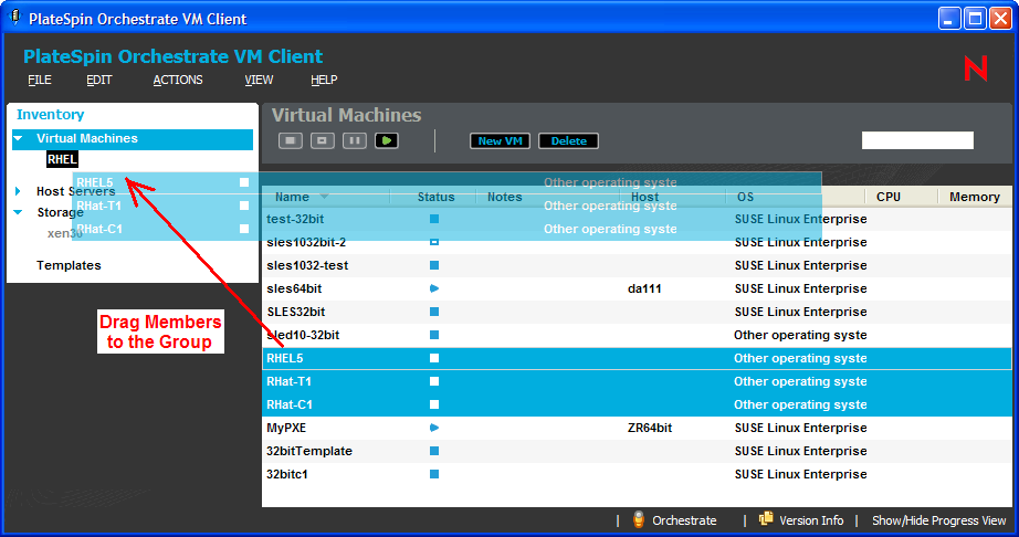 In the details panel, right-click one of the listed items (a VM, a host server, a repository, or a template), then drag and drop it into one of the view’s existing groups: