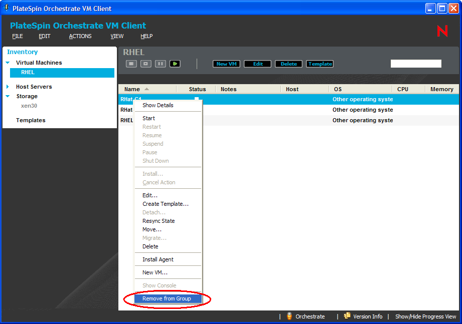 In the details panel, right-click one of the listed items (a VM, a host server, a repository, or a template).