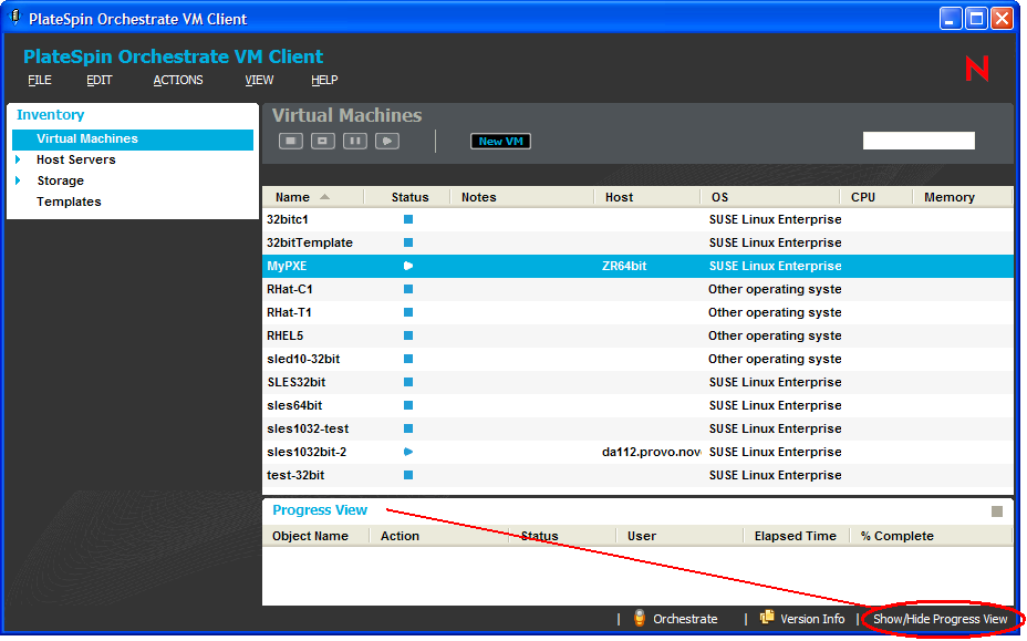The section is useful for when you have actions occurring simultaneously for multiple VMs because you can keep track of which ones are still running. The section is displayed at the bottom of the interface window. When is not displayed, you click > or double-click in the lower right of the VM Client window: