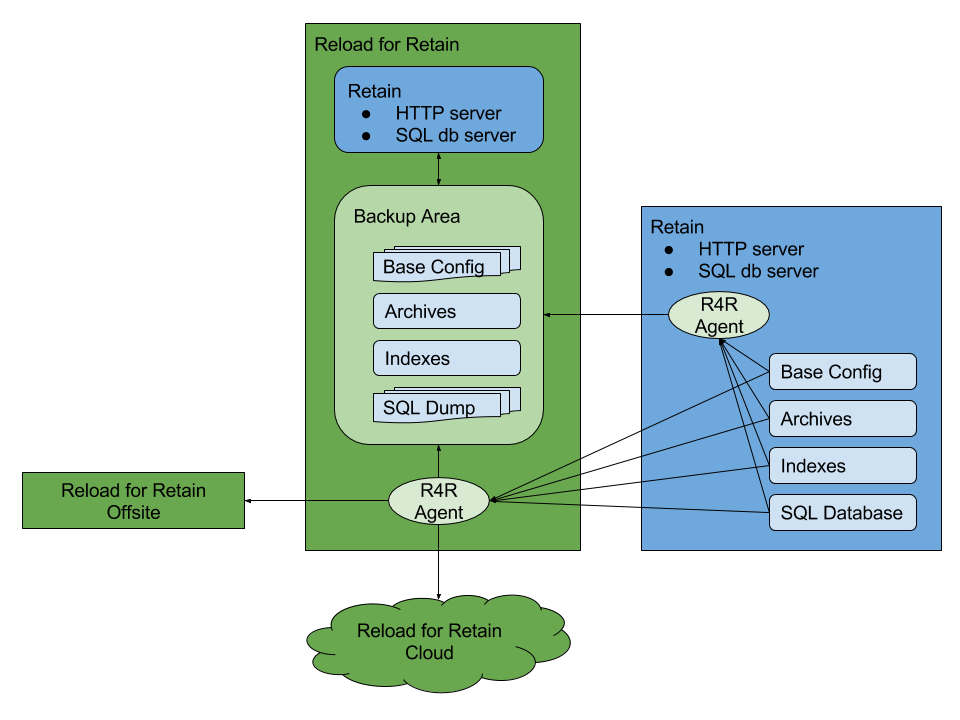 Reload for Retain uses a software backup agent to back up the essential files of Retain to the Reload server. The agent can be installed on a Linux-based Retain server or on the Reload for Retain server. The agent software can also backup to an off-site and cloud location.