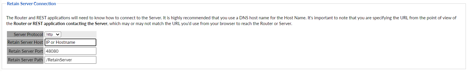 This specifies the connection address, port, and protocol that the Router and other REST applications should use to communicate with the Retain server. Settings must be correct for the Retain server from the point of view of the applications connecting to the Retain server.