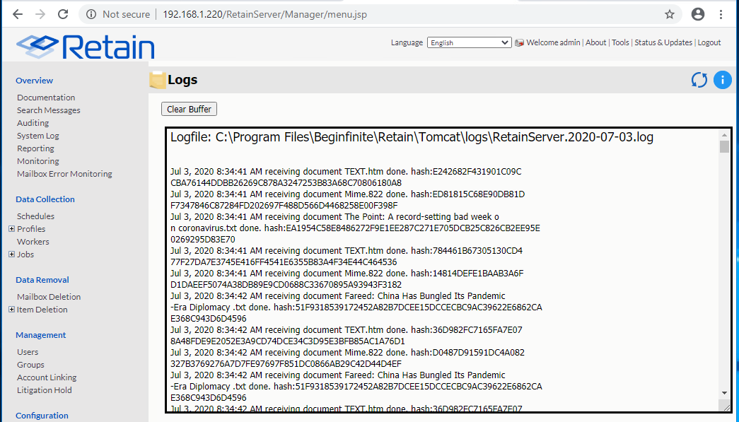 Linux: /opt/beginfinite/retain/tomcat8/logs