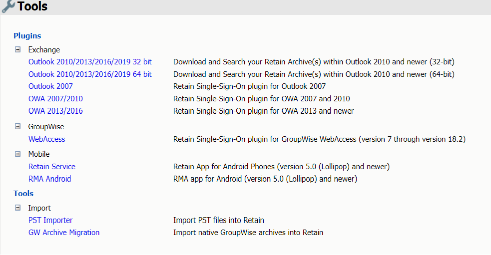To access the tools page, select the 'tools' link from the top right of the Retain Server administration page.