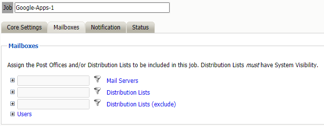 All data collection for Google Apps is configured through the Google Apps job interface. The jobs here combine the Profile, the Schedule, and a Worker together to archive a specified mailbox, distribution list, or domain. A Job must have a Profile, Schedule, Worker, and a target, mailbox, list, or domain, before it can be saved or run.