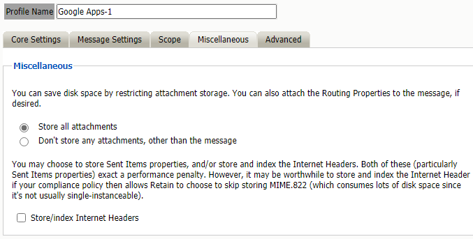 The miscellaneous tab allows the configuration to allow or deny archiving and indexing of attachments in Retain. If attachments are to be archived, they may also be indexed to provide searching capability in the browse messages interface.