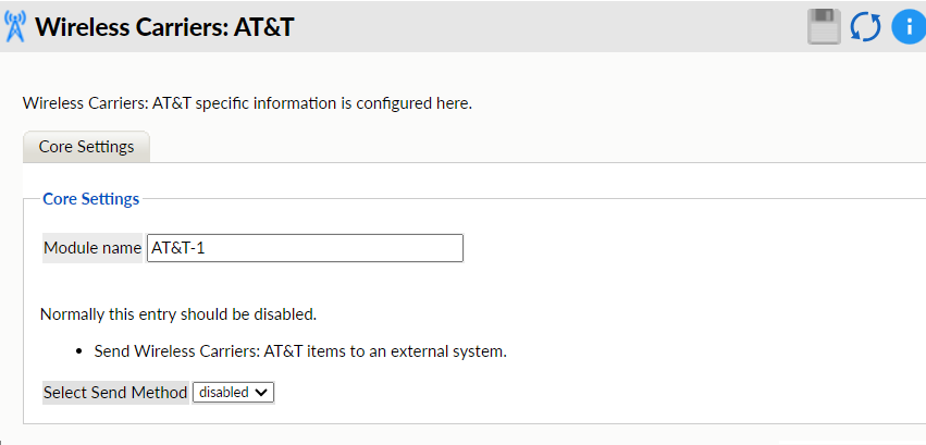 Path: Retain Server Manager > Configuration > Module Configuration > Wireless Carriers: AT&T-Configure > Core Settings