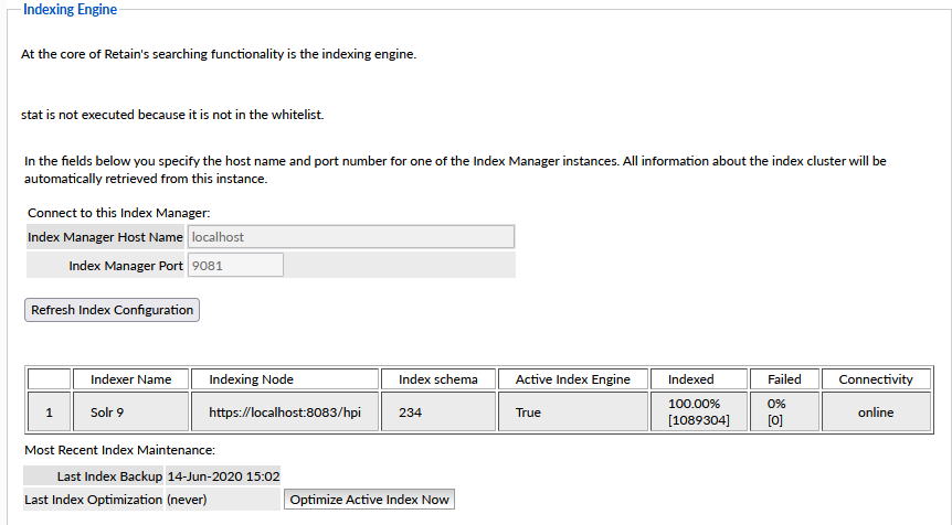 Path: Retain Server Manager > Configuration > Server Configuration > Index Tab > Indexing Engine Panel