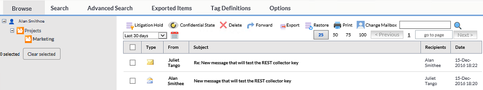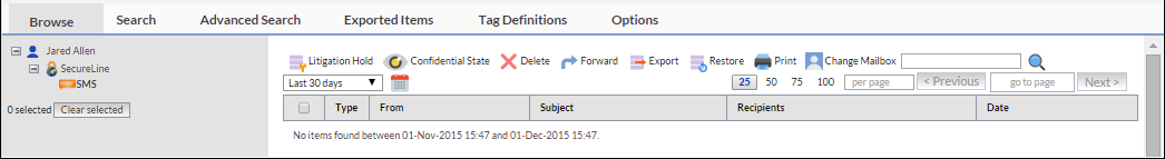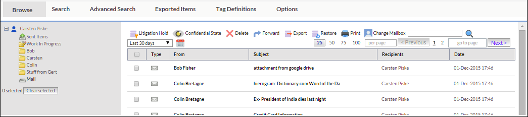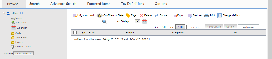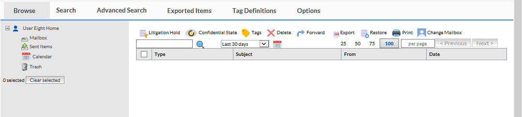 The Browse tab immediately grants access to the selected mailbox. Individual users will only see their own mailbox, while users with the administrator right to search all mailboxes will have the option to change mailboxes to another user.