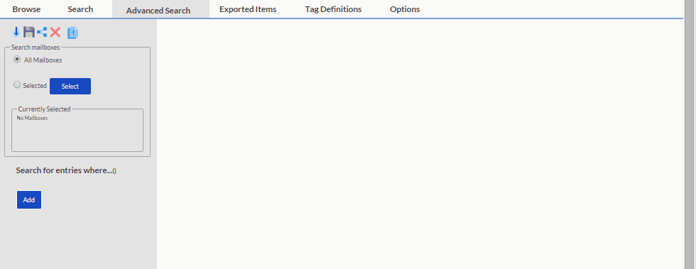 The system will begin to display results as soon as either the search mailboxes have been specified, or new search criteria has been added. To add new criteria, select the Add button.