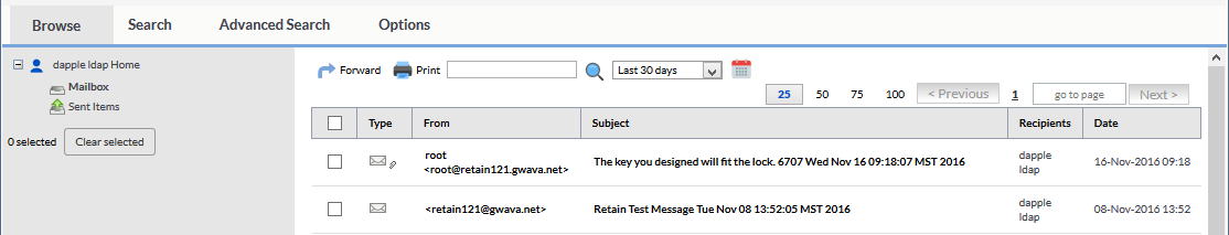 Retain’s browser-based user interface is the core of the information retrieval system for the Retain archive. Administrators, auditors, and users search for what they want and can view, print, export, or forward the results. General users have the right to view their own archive, and will immediately be brought to the Retain mailbox interface, but limited to their own account.
