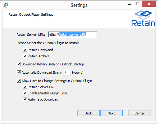 Please Select the Outlook Plugin to Install: There are two options for the plugin. Retain Download allows the user to download data from the Retain server to their workstation. Retain Archive opens the Retain interface in the Outlook window