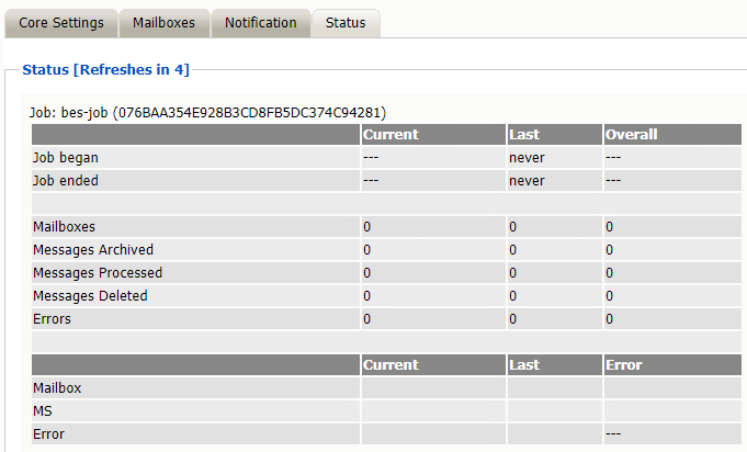 Initially, when the job has not yet run, there is no status to report. As soon as a job begins, this tab becomes a monitoring tool, reporting archive progress and any errors generated. You can view job statistics for Current (meaning currently running), Last (meaning most recently completed), and Overall (total) job runs, as follows: