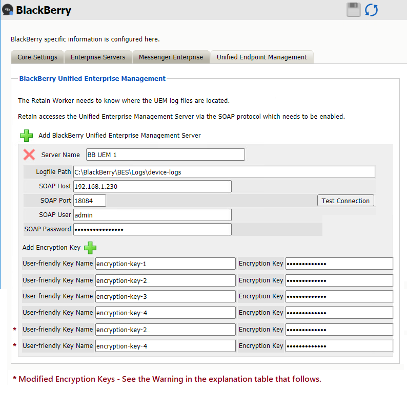 WARNING:UEM servers let users encrypt their messages using keys that are stored on the UEM server. Retain 4.9 and later supports UEM encryption and archives users’ message data using their encryption keys. UEM needs only the latest passwords, etc. to protect users’ message data. Previously entered passwords are overwritten on the system because they are no longer needed by UEM. Retain, on the other hand, requires the exact encryption key that was used at the time a message was archived in order to decrypt and retrieve it. Therefore, it is critical that