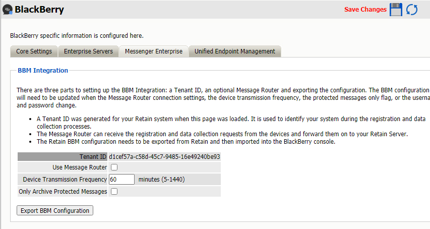Path: Retain Server Manager > Configuration > Module Configuration > Blackberry-Configure > Messenger Enterprise