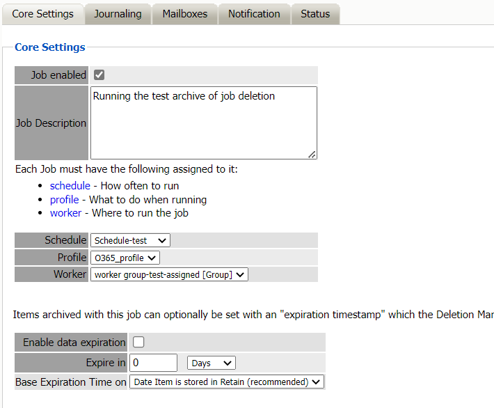 The Core Settings of a job contains configuration which must be set for the job to be saved and become active. A job must be enabled before it will run. Jobs must also have a specified schedule, profile, and worker. These are all selected from drop-down menus, and will not be populated unless those items are already configured in the system.