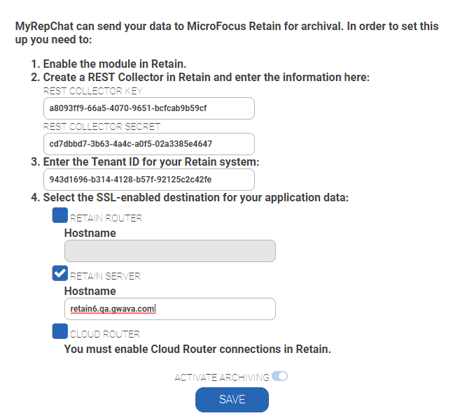 Enter the information gathered in Configuring the Ionlake Module in Retain in your ionlake MyRepChat system to send the archive data to Retain. Below is a screen shot of the MyRepChat interface to enter your Retain information: