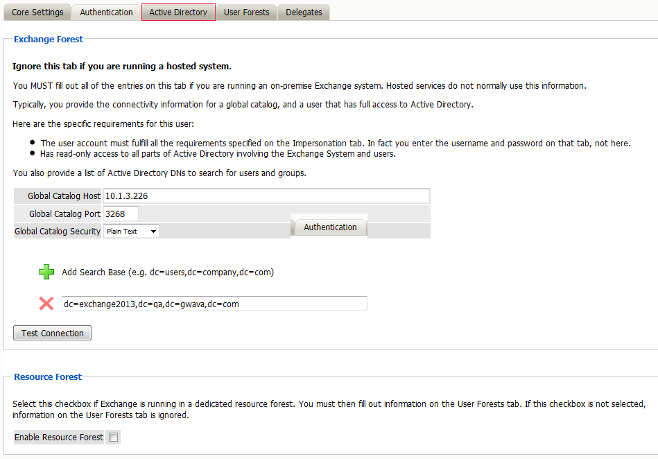 Use this section to configure a module for a hosted Exchange system where you don’t have administrative access to its associated Active Directory services.